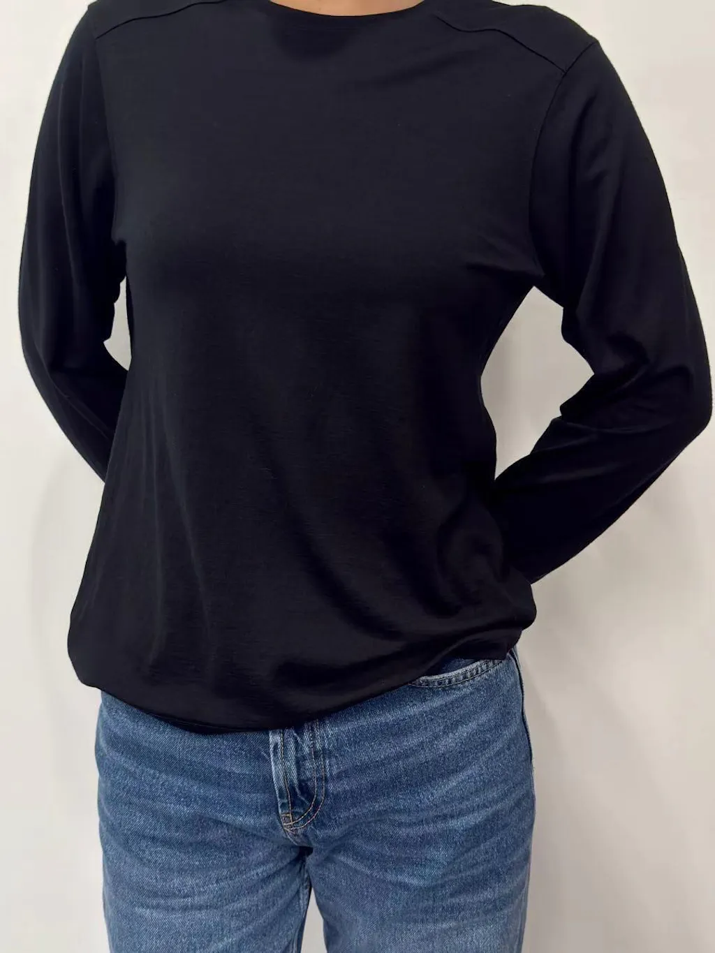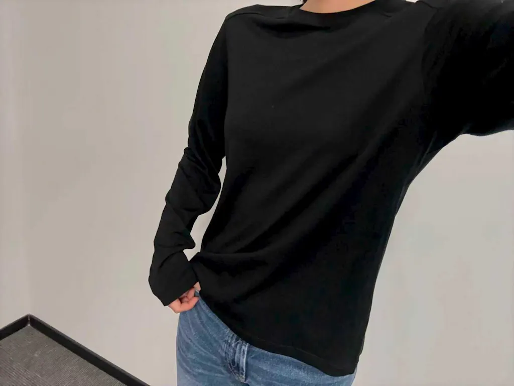 Secured with double-needle stitching for bulletproof durability, this thoughtful design detail prevents seam stress and tearing while reaching, stretching, or layering.